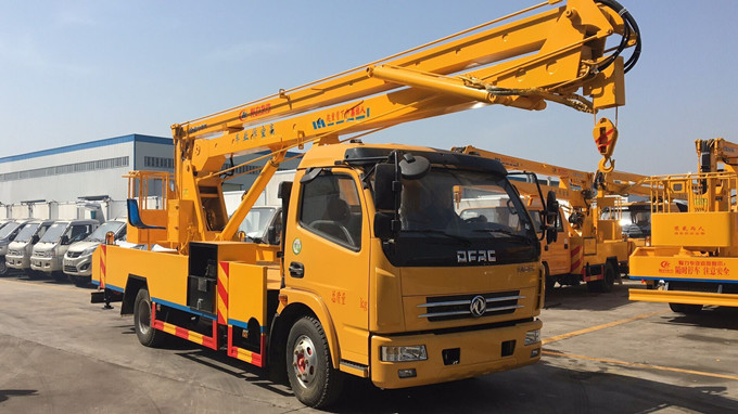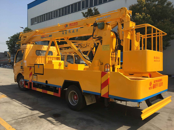 东风大多利卡18米高空作业车采用折叠式曲臂结构,作业臂为三节折叠式,工作斗和转台双工作位,上下操作,液压手动控制,可360度回转,四液压支腿,带1吨吊钩,工作斗大承重 200公斤,钢制工具箱及围板、花纹防滑走台板。